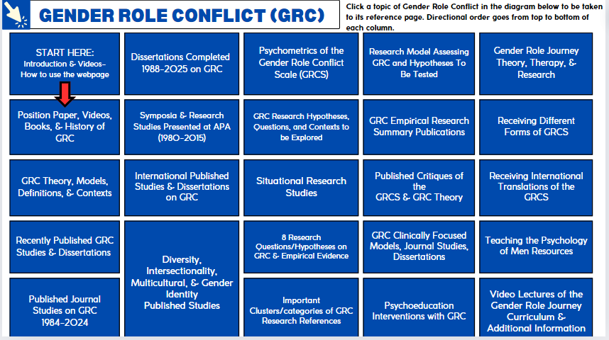 This file is useful to researchers who want critical summaries of the GRC Research Program across the many empirical studies. Seven journal publications or book chapters from 1995 to 2017 provide critical summaries of past empirical research.A video presentation “40 Years of the Gender Role Conflict Research Program,” is available with a special focus on empirical research from 2013-2016. I also provide some memories about developing the research program in this video.