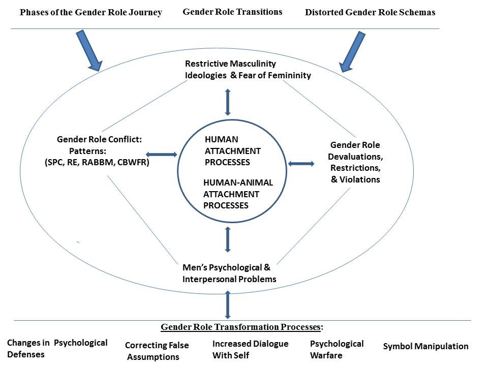 The primary theoretical model used to summarize the premises of GRC dates back to the early 1980’s (O’Neil, 1981a, 1990, 2008b; O’Neil, et al.,1995). Figure 1 depicts a newer model that shows gender related contexts and men’s psychological problems related to human attachment and the human-animal attachment. This new model also shows the process oriented factors of men’s attachment as well how transformation can occur. A brief description of the new model provides a summary of ideas about GRC in the context of the animal-human bond.
