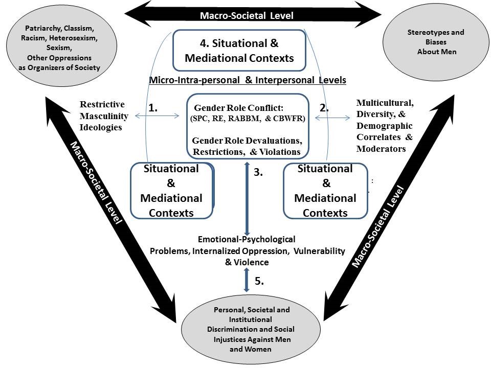 Just below the micro-intrapersonal and interpersonal levels in Figure 1 are the GRC patterns: Success, power, and competition (SPC), restrictive emotionality (RE), restrictive and affectionate behavior between men (RABBM), and conflict between work and family (CBWFR) as well as the personal experiences of GRC in terms of gender role devaluations, restrictions, and violations. On the far left, restrictive masculinity ideology is shown related to GRC with a bi-directional arrow (line 1) suggesting that masculinity ideology relates to GRC and vice versa. On the right, the multicultural, diversity, demographic, correlates and moderators are shown and include race, ethnicity, culture, class, sexual orientation, age, religious orientation, and cultural identities and ideologies religion, and other diversity factors. The bi-directional arrows show that these multicultural and demographic correlates and GRC relate to each other (Line 2). Restrictive masculinity ideologies, multicultural, demographic correlates and GRC are hypothesized to relate emotional and psychological problems, vulnerability and internalized oppression (lines 3). The situational and mediation contexts shown on three sides of the figure (Number 4) imply that third variables and actual events can play a part in the how GRC contributes to men’s psychological problems. Finally, line 5 implies that men’s emotional psychological problems could be directly related to personal, societal, and institutional discrimination and social injustices toward men.