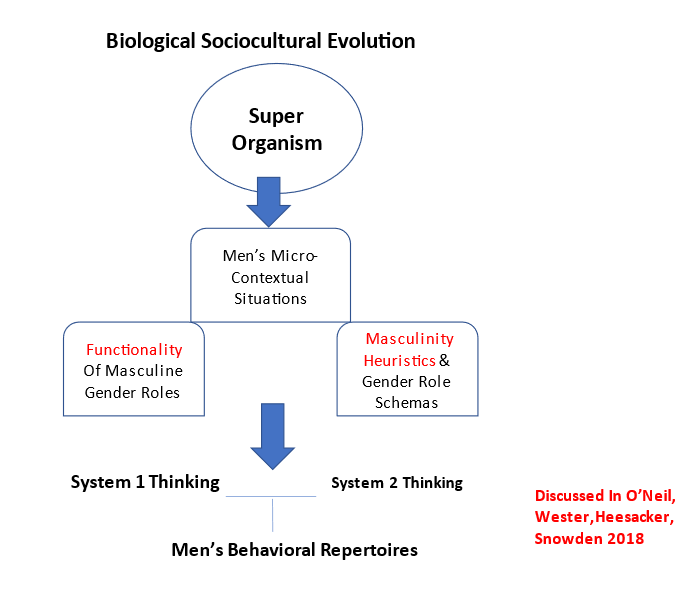 Linking this work to our earlier discussions of heuristics and superorganisms, we believe that traditional male gender role components drive superorganism status in men, and are activated automatically. That is, they are activated quickly and without conscious decision-making. They efficiently guide behavior in reaction to the situation. They reflect System 1 thinking. From this perspective, hegemonic masculinity can be viewed as the natural consequence of the traditional male gender producing superiority over other species and over women and girls. The so-called “battle of the sexes” reflects this competition, as does the feminist movement, which may be viewed as the development of women’s superorganism in response to male domination. Indeed, there remain parts of this world where hegemonic masculinity still holds sway; one potential explanation for this could be that the biological and environmental presses experienced in those locations still confer the significant benefits associated with superorganism status. Consider a war-torn nation, or a country which is struggling to recover from a long-term environmental disaster. On a smaller level, consider the behavioral patterns evidenced by individuals as well as larger groups of men. Environments where men are much more likely to face real threats of predation while also experience the real need to be effective predators may still confer survival benefits to those affiliated with superorganism status. We raise these examples only to provide anecdotal evidence for the rise of traditional masculinity being part of the sociocultural evolutionary process that was effective in responding to biological and environmental presses in antiquity but which are less beneficial (and more costly) now.