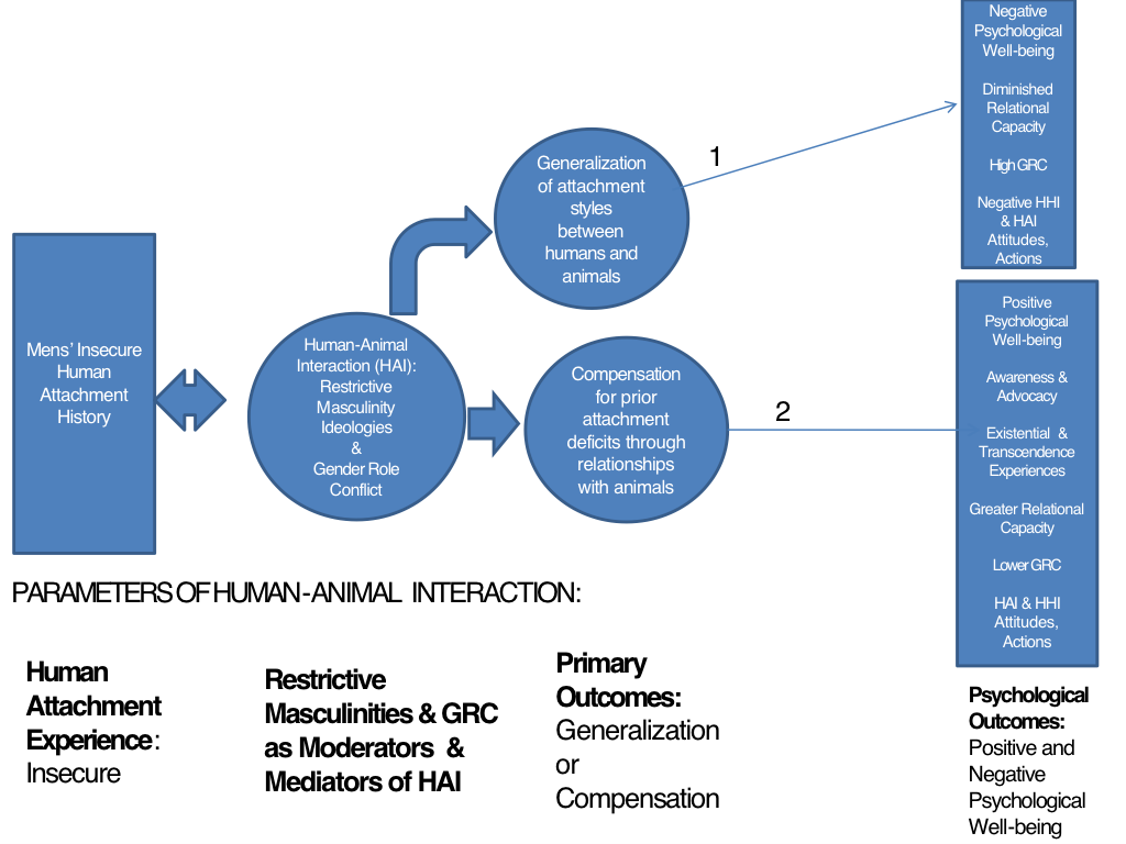 Figure 1 depicts a model that expands our understanding of the animal human bond by focusing numerous contexts, processes, and outcomes. At the bottom of the figure are four contextual parameters that include the actual attachment experiences, moderators and mediators of the human/animal processes that include restricted masculinity ideology and gender role conflict, and psychological outcomes that include concepts like generalization, compensation, and positive and negative psychological outcomes.