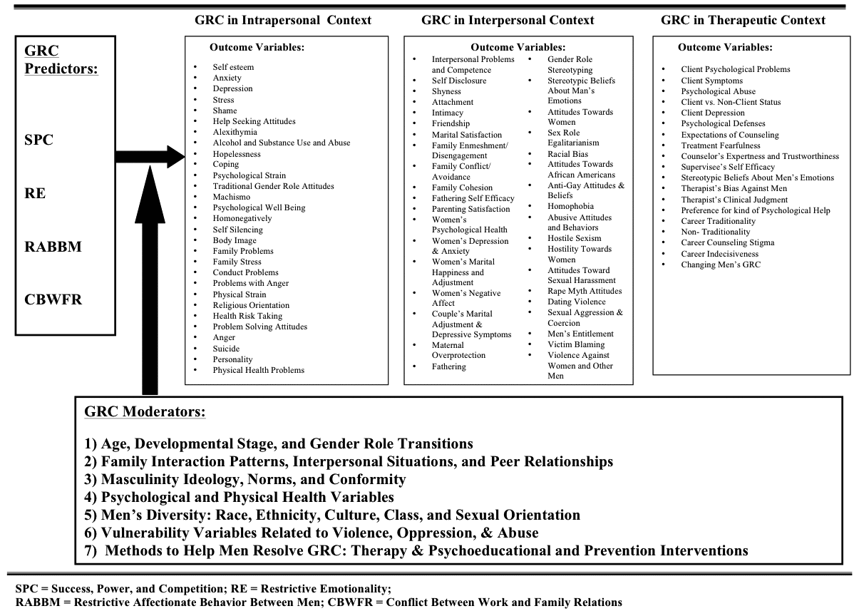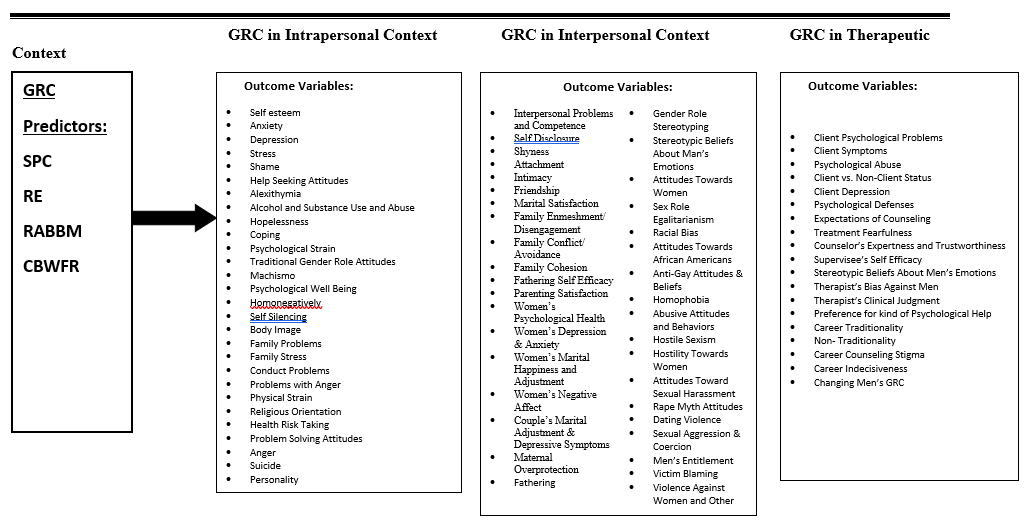 Figure 1 shows the predictive variables related to men’s GRC. The purpose of Figure 1 is to help researchers generate prediction studies using the past research and theory. The top left bold arrow in Figure 2 shows the GRC predictors (SPC, RE, RABBM, CBWFR) relating to outcomes in the three GRC contexts shown in the top rectangles. These GRC contexts are: (a) GRC in an intrapersonal context; (b) GRC in an interpersonal context; and (c) GRC in a therapeutic context.