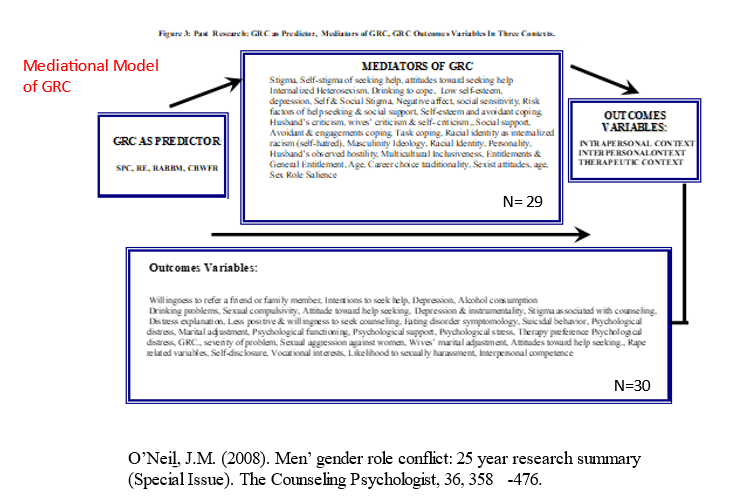 There is both empirical and theoretical justification for the mediational research paradigm shown in Figure 3. For mediation analyses, predictors need to be significantly related to outcome variables (Frazier et al., 2004). As this research review has shown, SPC, RE, RABBM, and CBWFR have been significantly correlated with the 88 outcome variables in the large rectangle in Figure 3 (See the longer arrow in the middle of Figure 3 for this relationship). Presumed predictors must also be theoretically related to the mediators (Frazier et al., 2004). Men’s GRC has been empirically or theoretically related to the proposed mediators as shown in Figure 3 (See shorter arrow in the upper left corner).