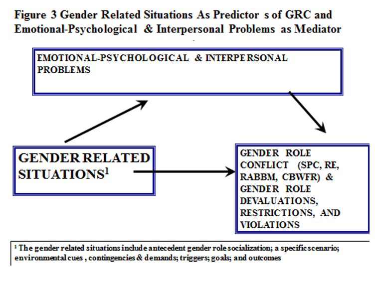 The research question for both Figure 3 is how and why do gender related situations relate to emotional-psychological and interpersonal problems with GRC as an outcome in men’s lives. In other words, is GRC an outcome of any negative situational contexts mediated by emotional-psychological problems? For Figure 4, the research question is how does GRC relate to negative gender related situations that cause men’s psychological problems. In other words, does GRC mediate situations in producing negative outcomes for men? Both figures expand GRC’s role from just being a predictor of men’s problems to both a mediator and outcome of situational contingences that are gender related. This research paradigm suggests many new research questions on how GRC is affected by situational cues in men’s lives. For example, these new models promote situational GRC “from others” and “towards others” to be more completely conceptualized and researched .